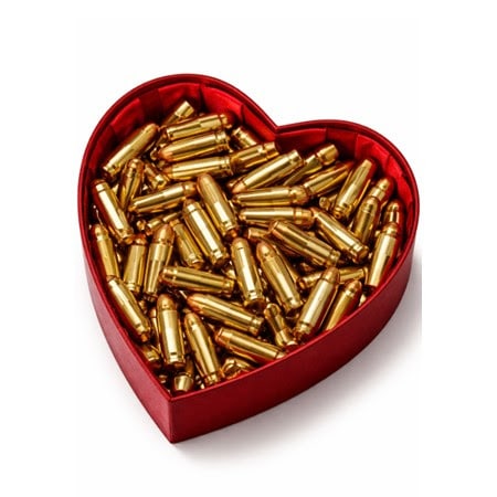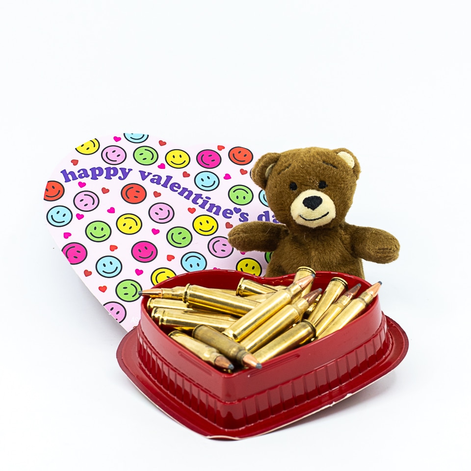 Valentines heart shaped candy box filled with pistol ammunition used in Feb 2026 email blast and related blog post that was centered around the benefits of reloading handgun ammunition.