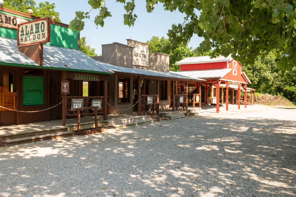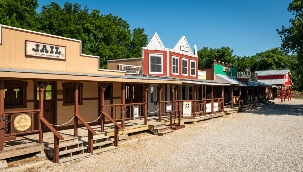 thoughtfully recreated Old West buildings inspired by real Kansas history, including a