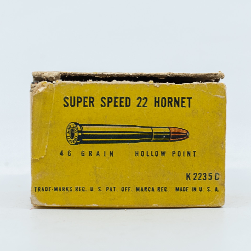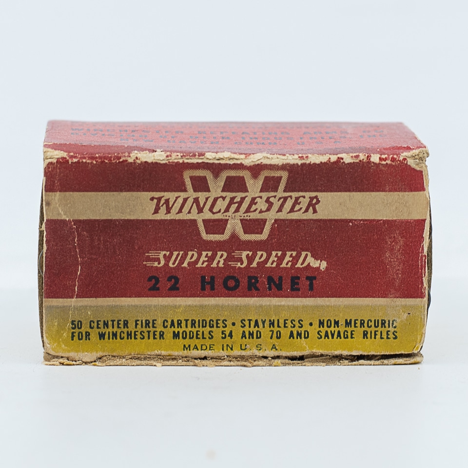 Vintage WINCHESTER #K2235C factory ammunition “Made for Model 54 & 70 and Savage” rifles, 22 HORNET ammunition, 40-grain Hollow Points (HP) bullets loaded, 50 ROUNDS.