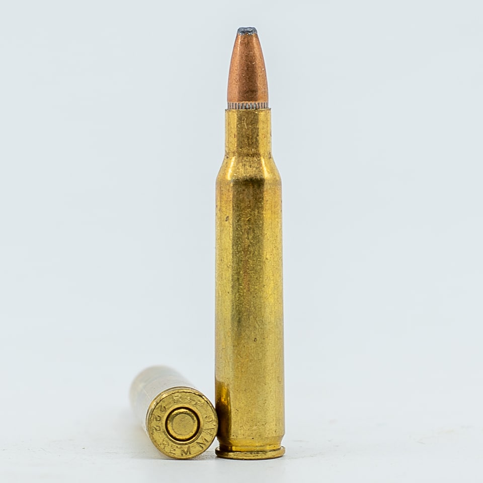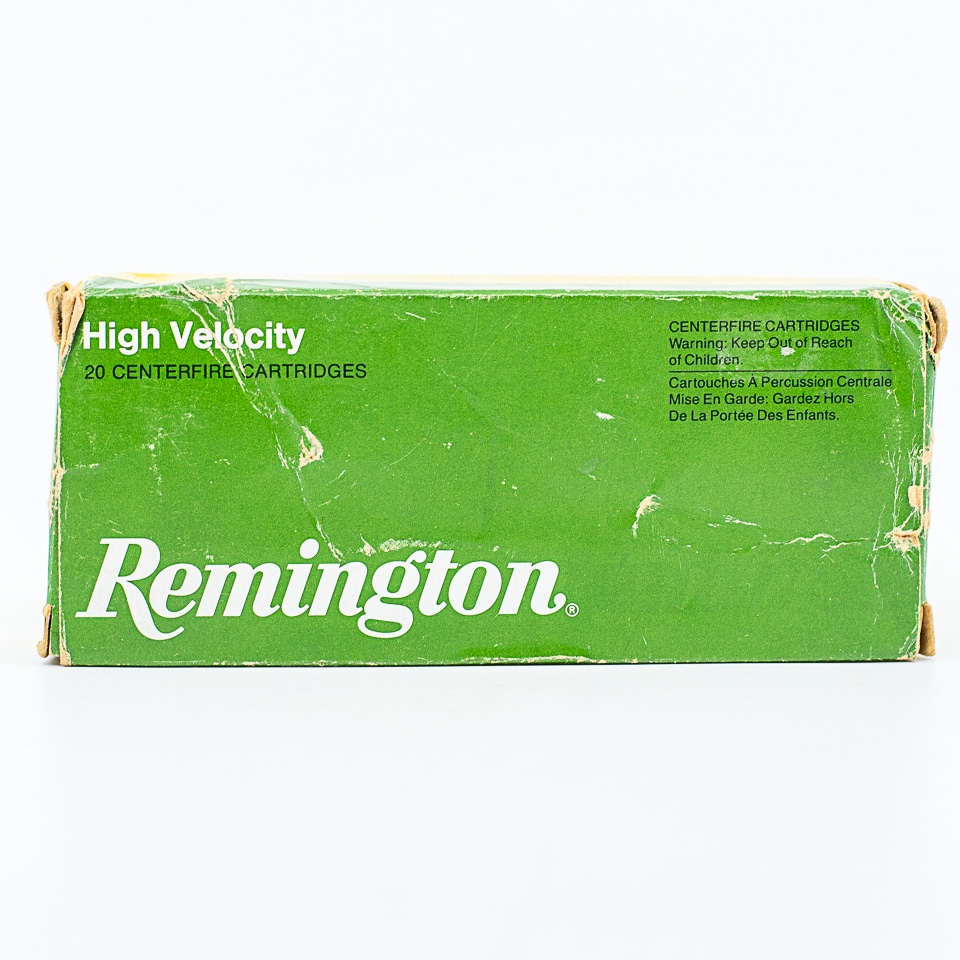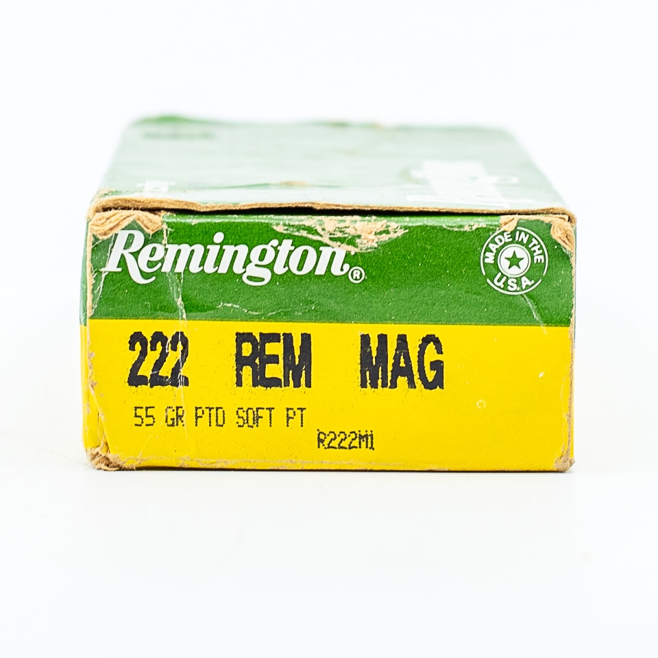 Remington factory 222 REMINGTON MAGNUM ammunition, 55-grain Pointed Soft Point (PSP) bullets, 20-rounds . Box is intact with no missing flaps. Circa 1993-1996