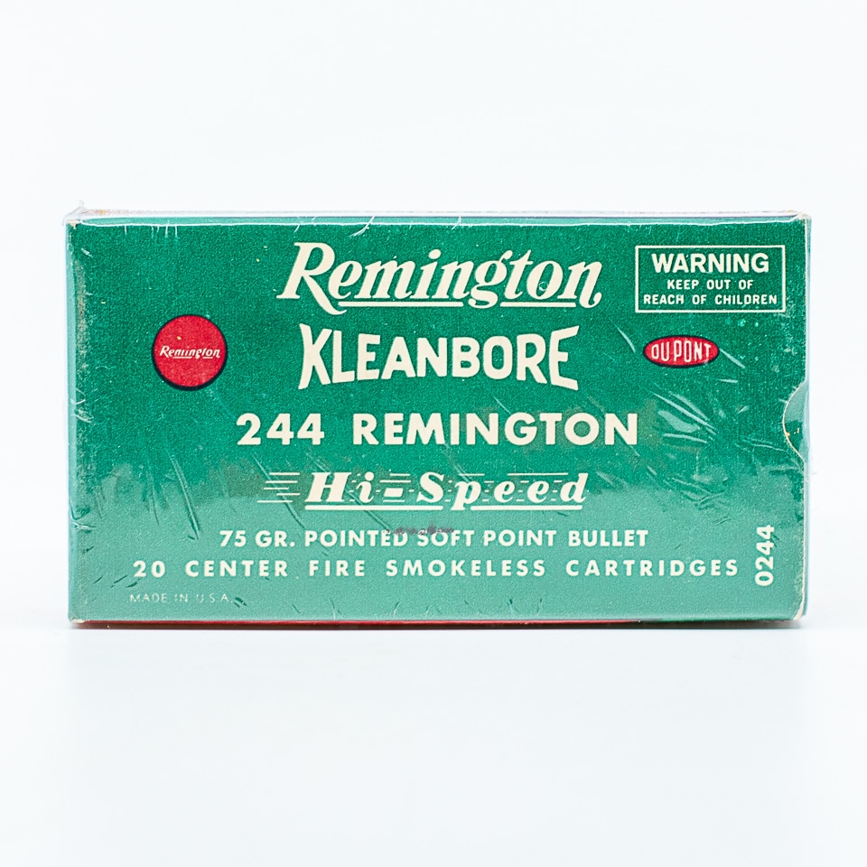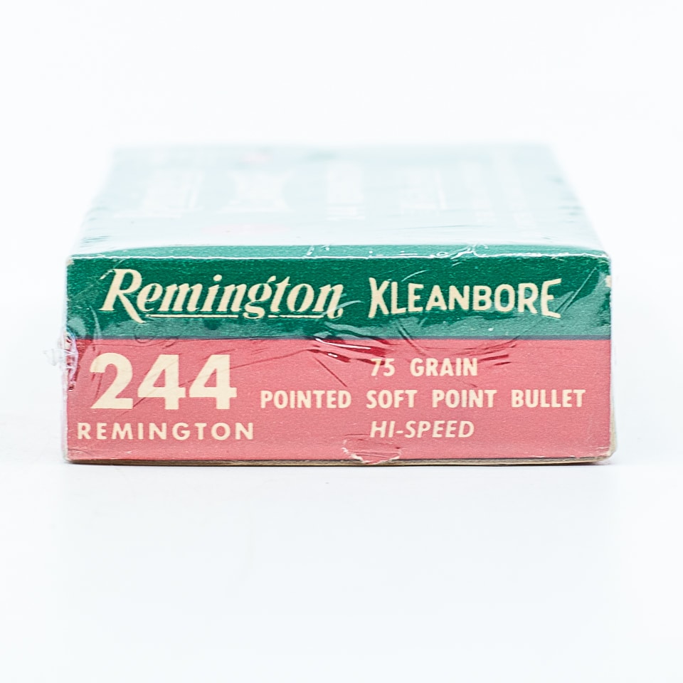Vintage REMINGTON “KLEAN BORE” factory ammunition, 244 REMINGTON (aka 6mm Remington), 75-grain Pointed Soft Point (PSP) bullets.