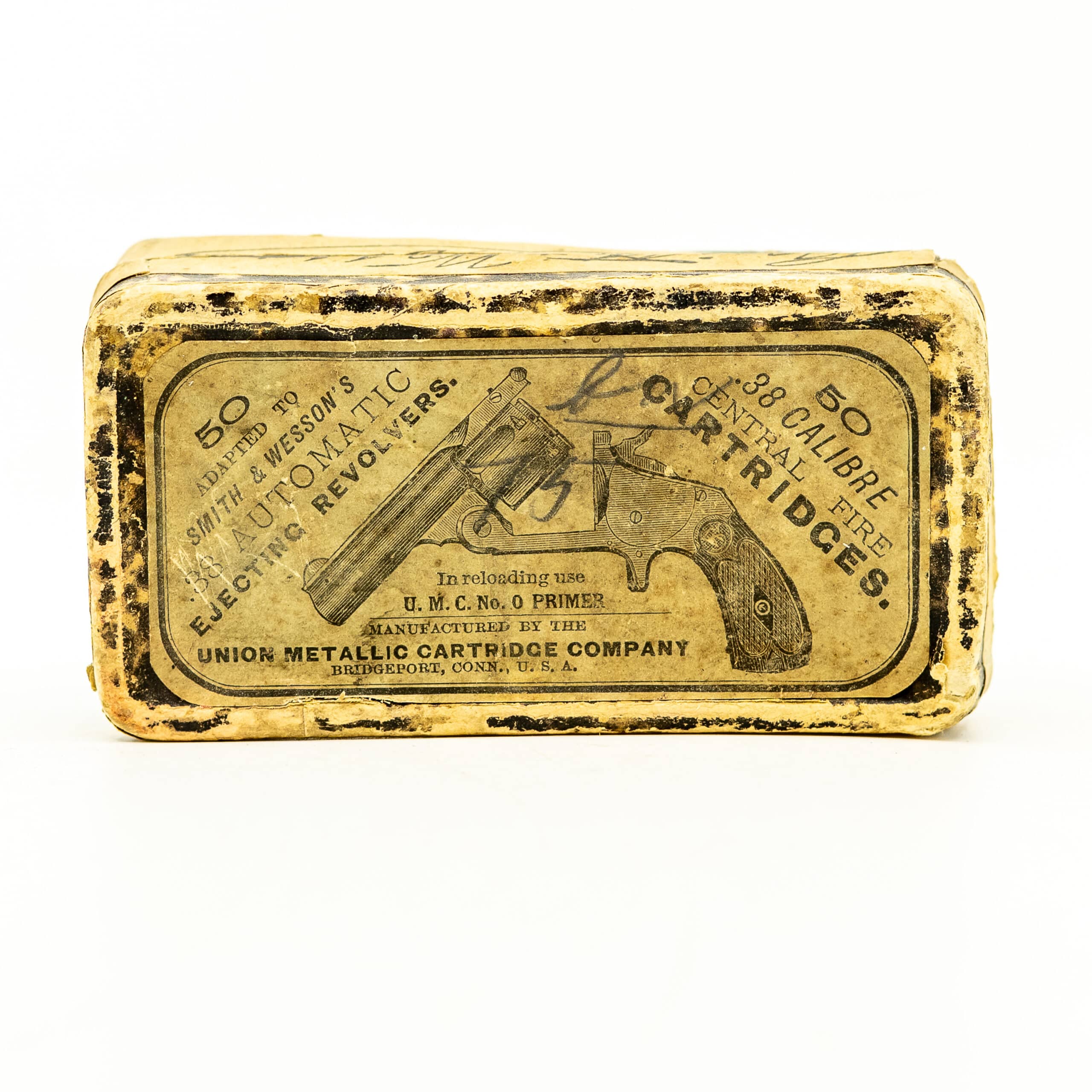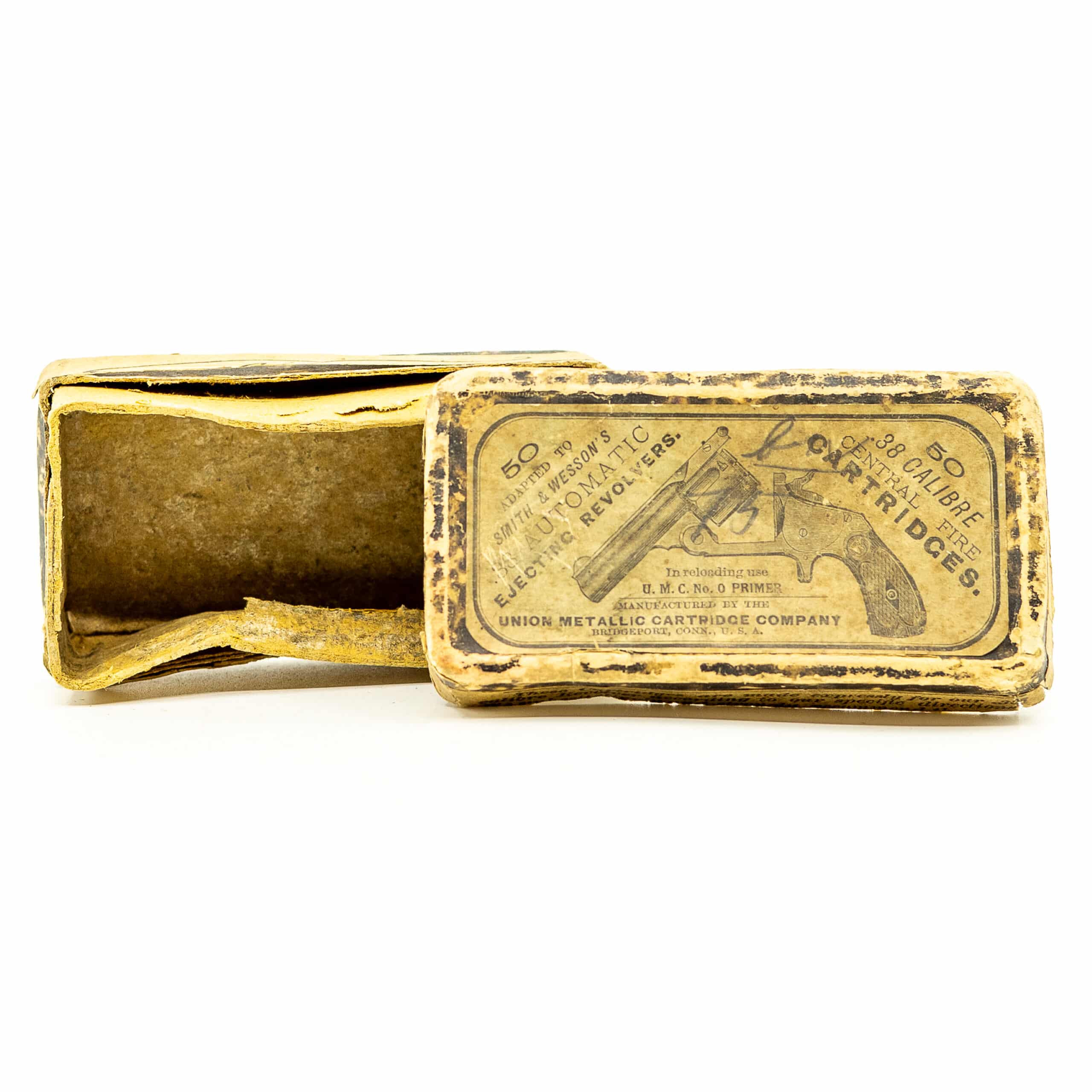 This is a Union Metallic Cartridge Company (U.M.C.) No. 0 Primer box, 50-count, labeled for .38 S&W, with Smith & Wesson revolver illustration. These are late 19th to very early 20th century, roughly 1890–1908, prior to the Remington-UMC merger branding becoming dominant.