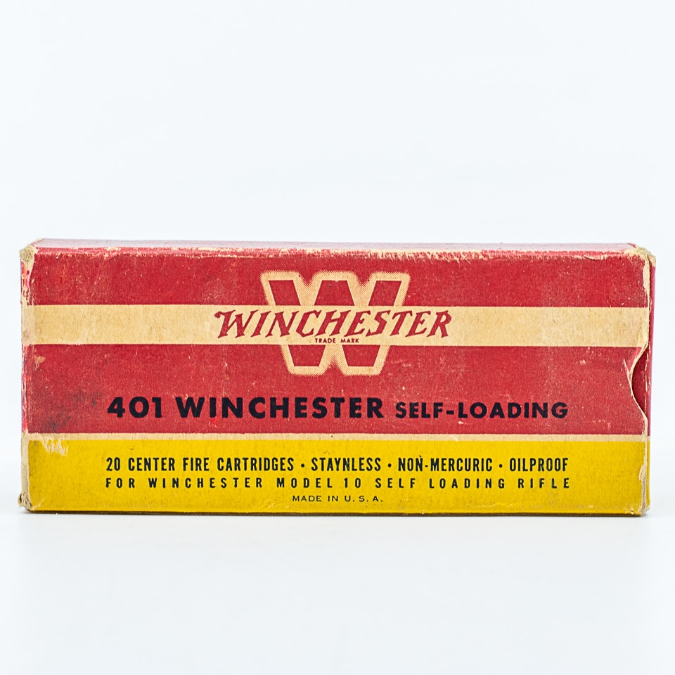 Vintage WINCHESTER factory ammunition, .401 Winchester Self Loader (401 WSL), 170-grain Soft Points (SP), 20 rounds. Box is intact, not tears or separation. Usually there was inner flaps on this box design, if so there is none. Cartridges are clean.
