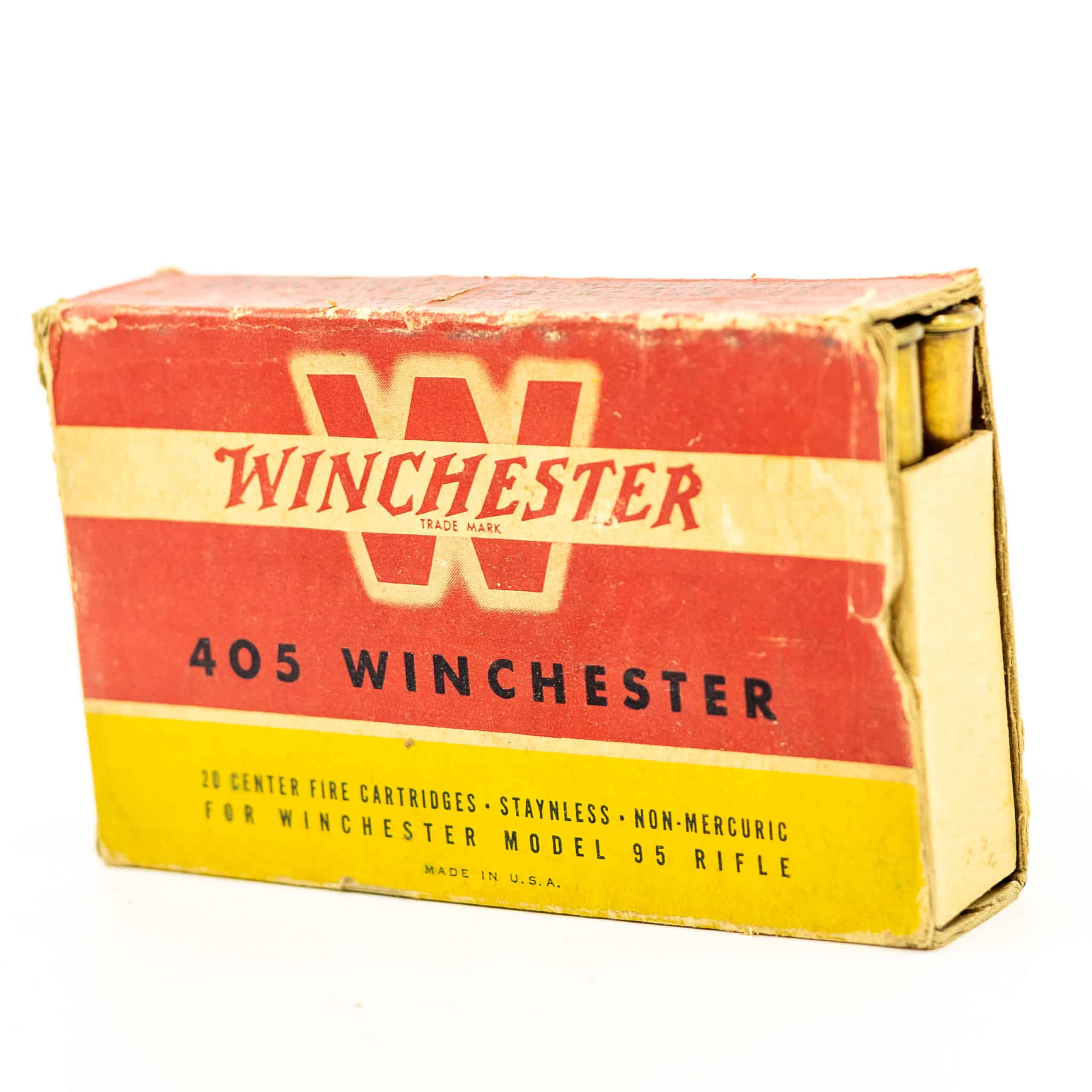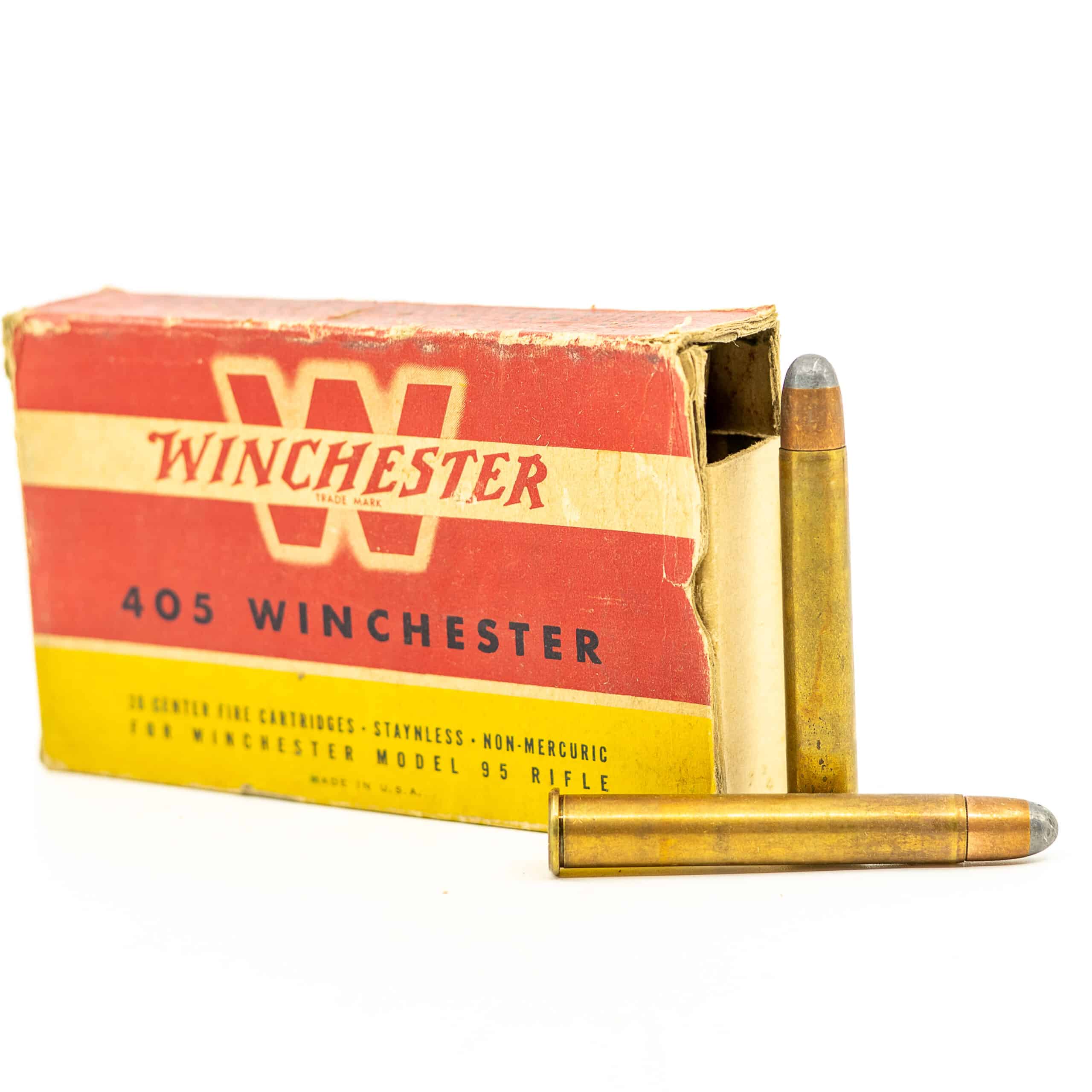 Vintage WINCHESTER factory ammunition 405 WINCHESTER 300-grain Soft Point Round Nose, 18-rounds. Packaged in the depression-era red and yellow box with famous distinct “W”. Inside flaps missing on left end, flaps missing on right end. All rounds are bright and clean, head stamp “WRA” which became standard 1928-1929.