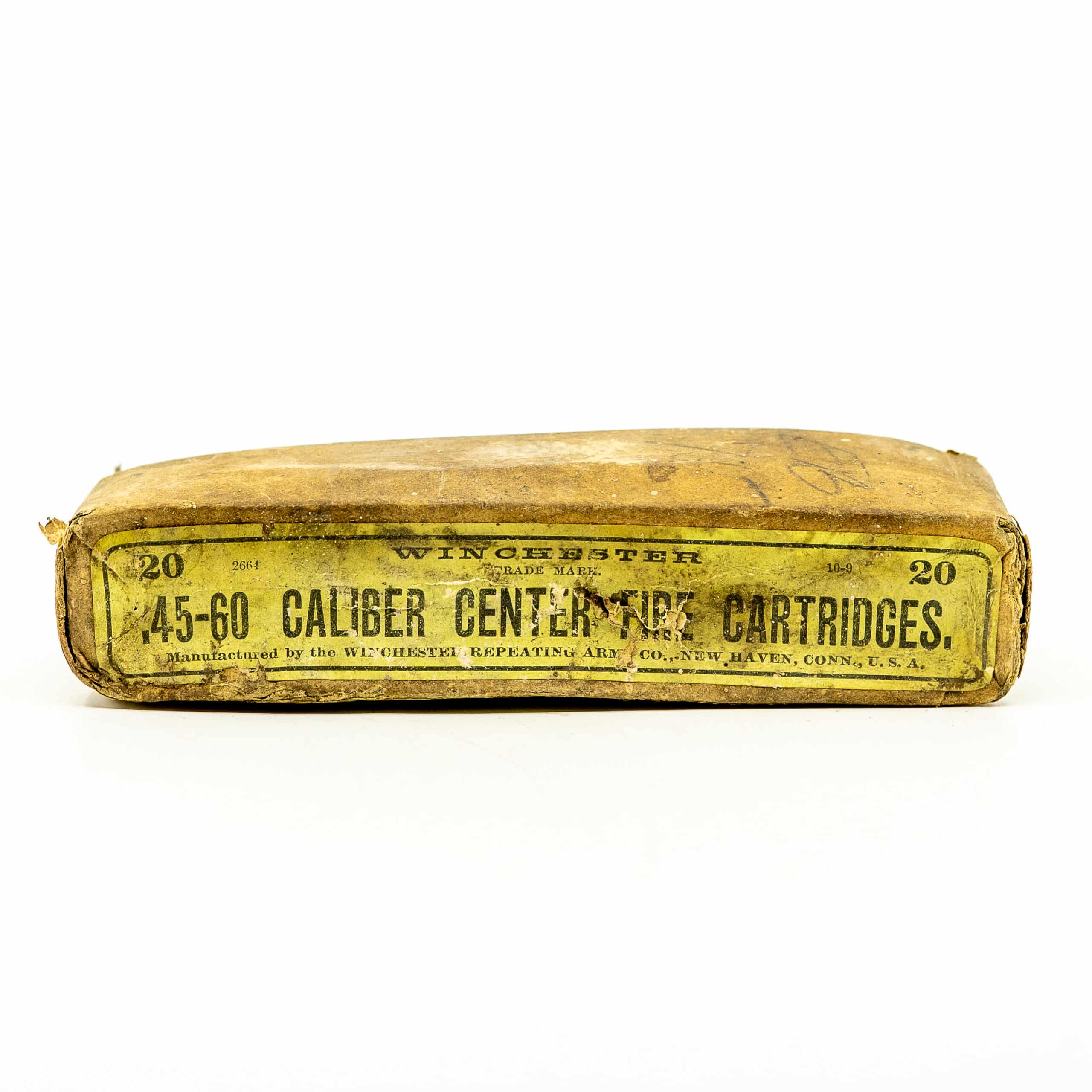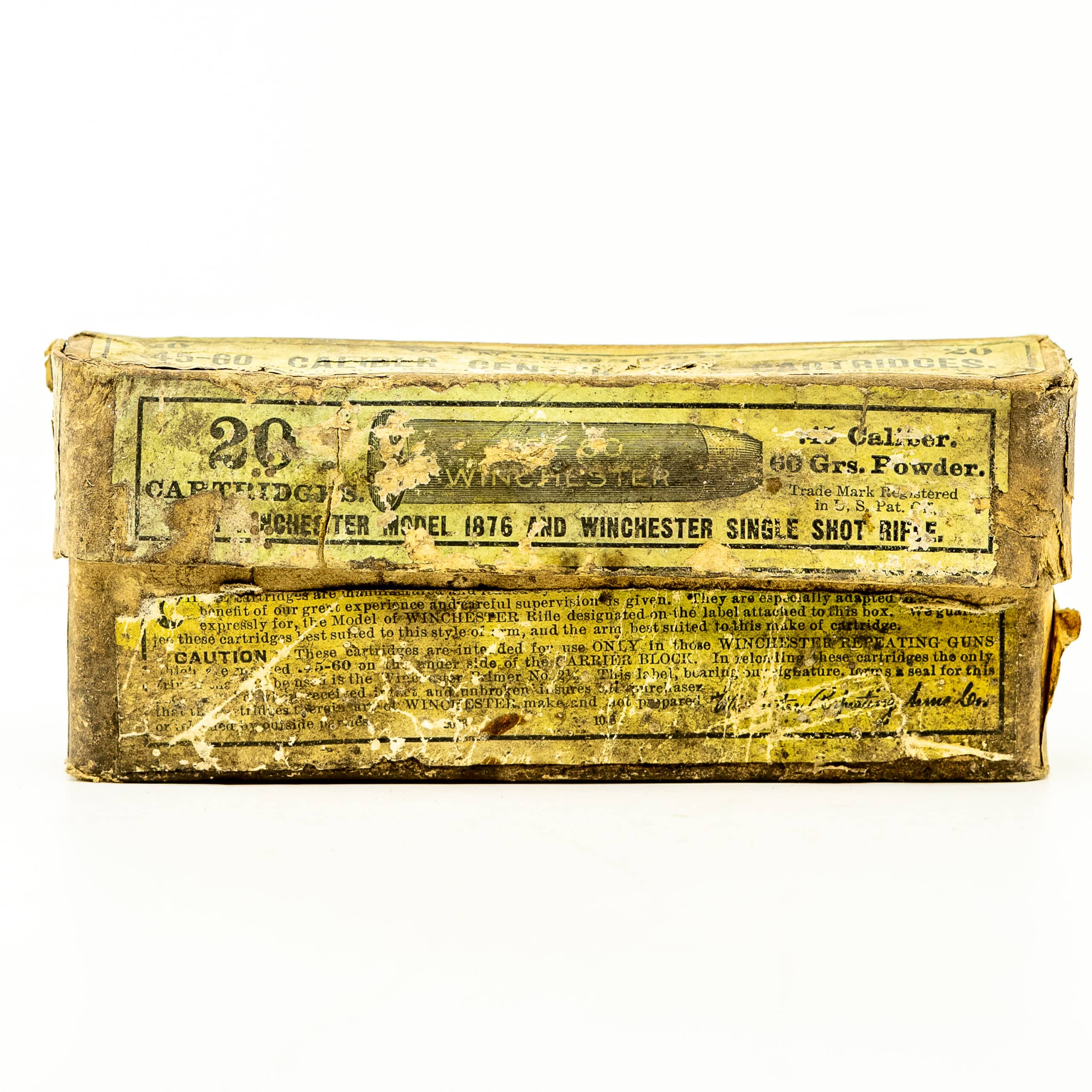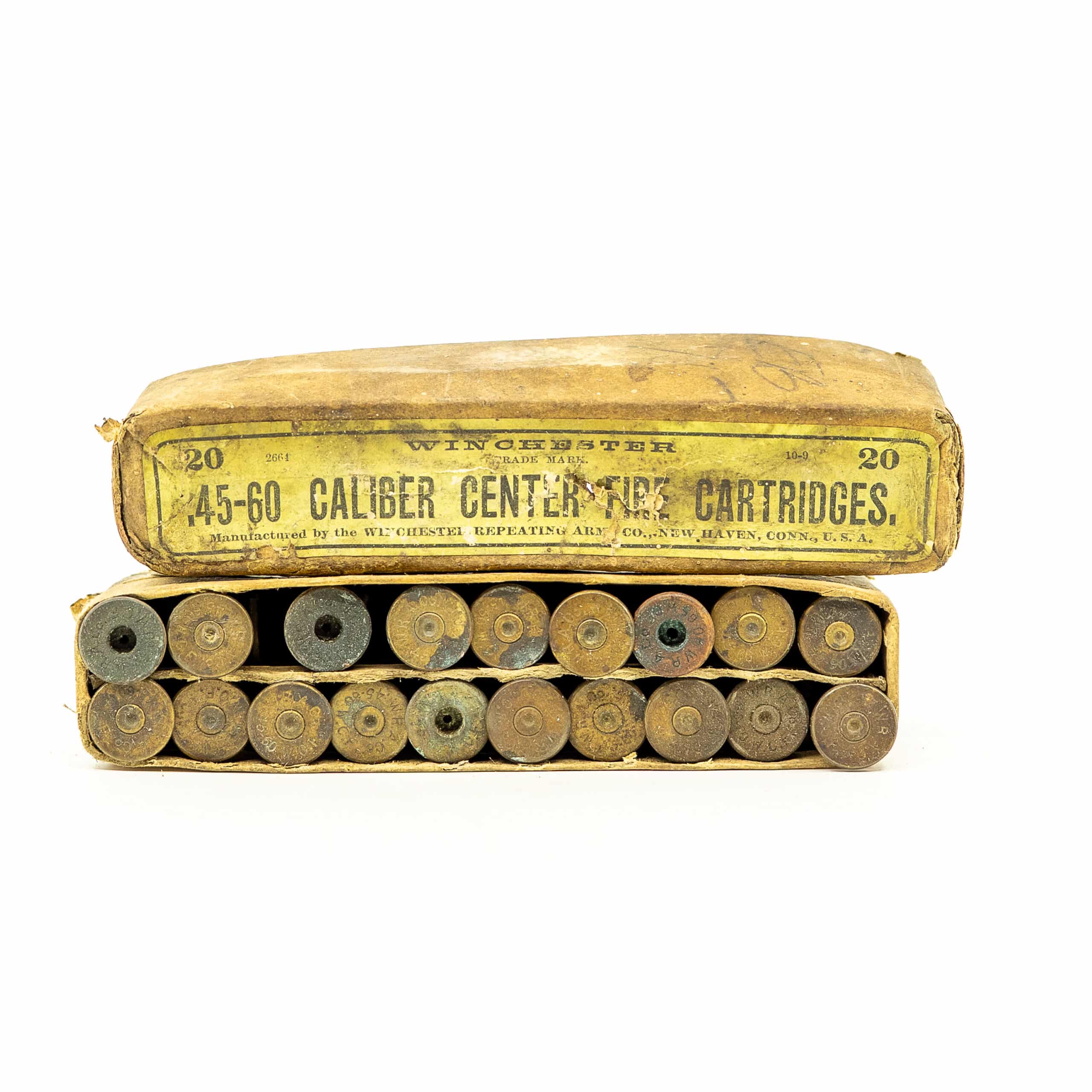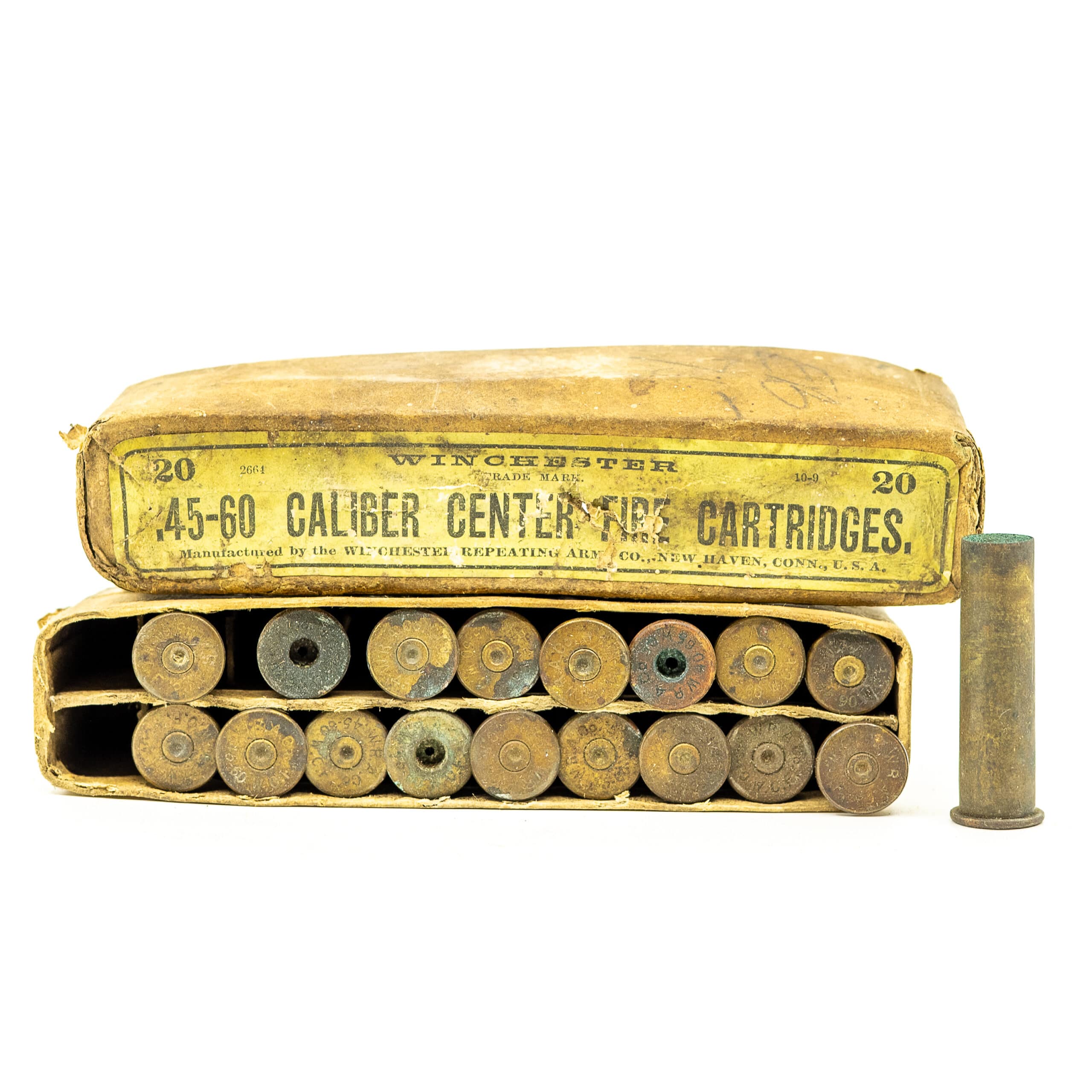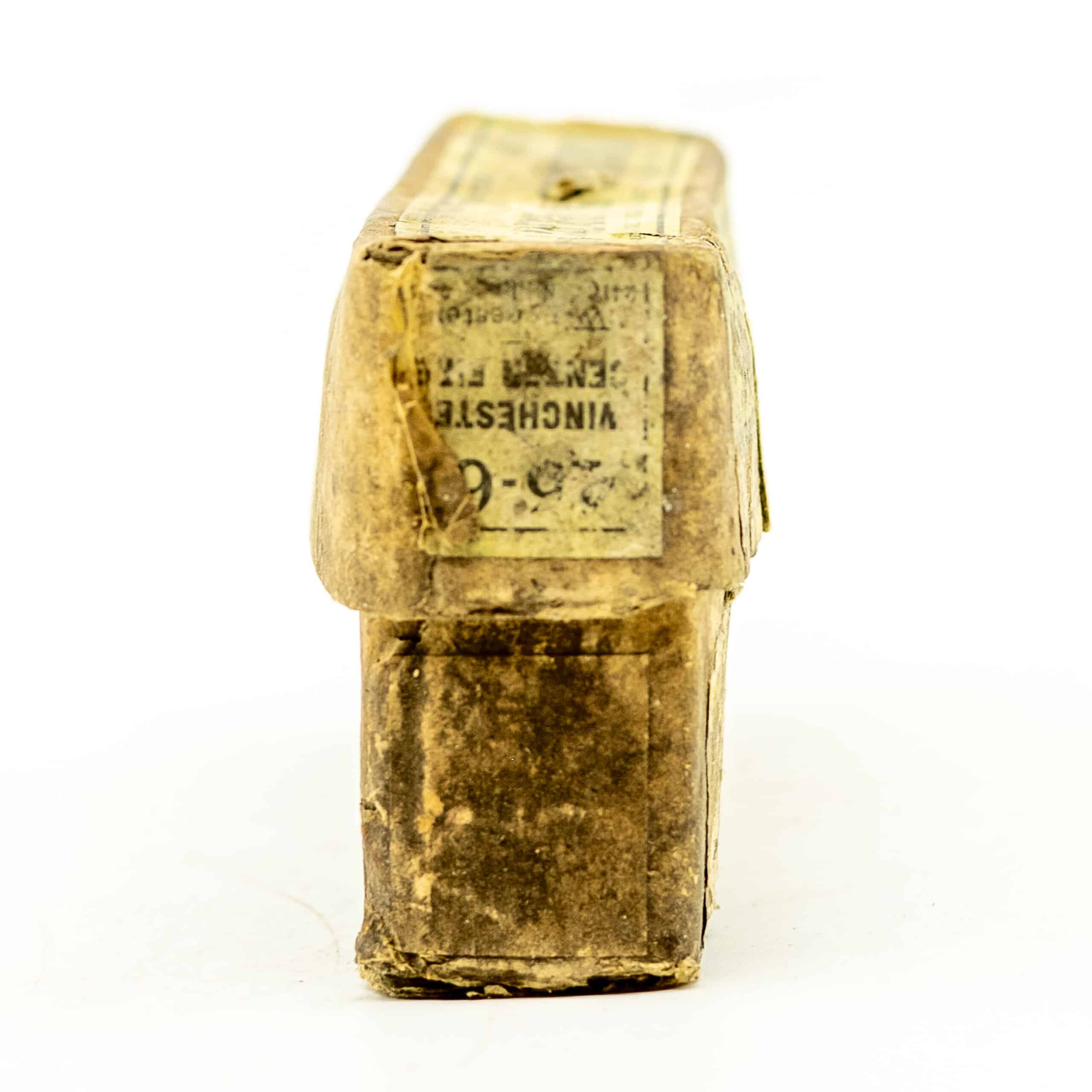 Vintage Winchester .45-60 Winchester. 18 fired case and one live round in Winchester slip top box . Box condition is worn but intact. CIRCA 1880’s-1890’s.