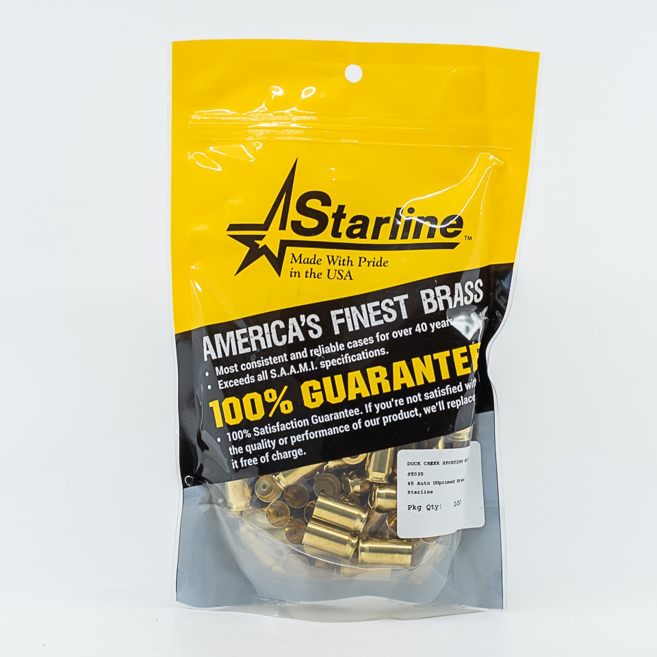 Bag of 100 factory new STARLINE unprimed 45 A.C.P. (45 Auto) brass pistol cases. Uses large pistol primers, Starline #1500.