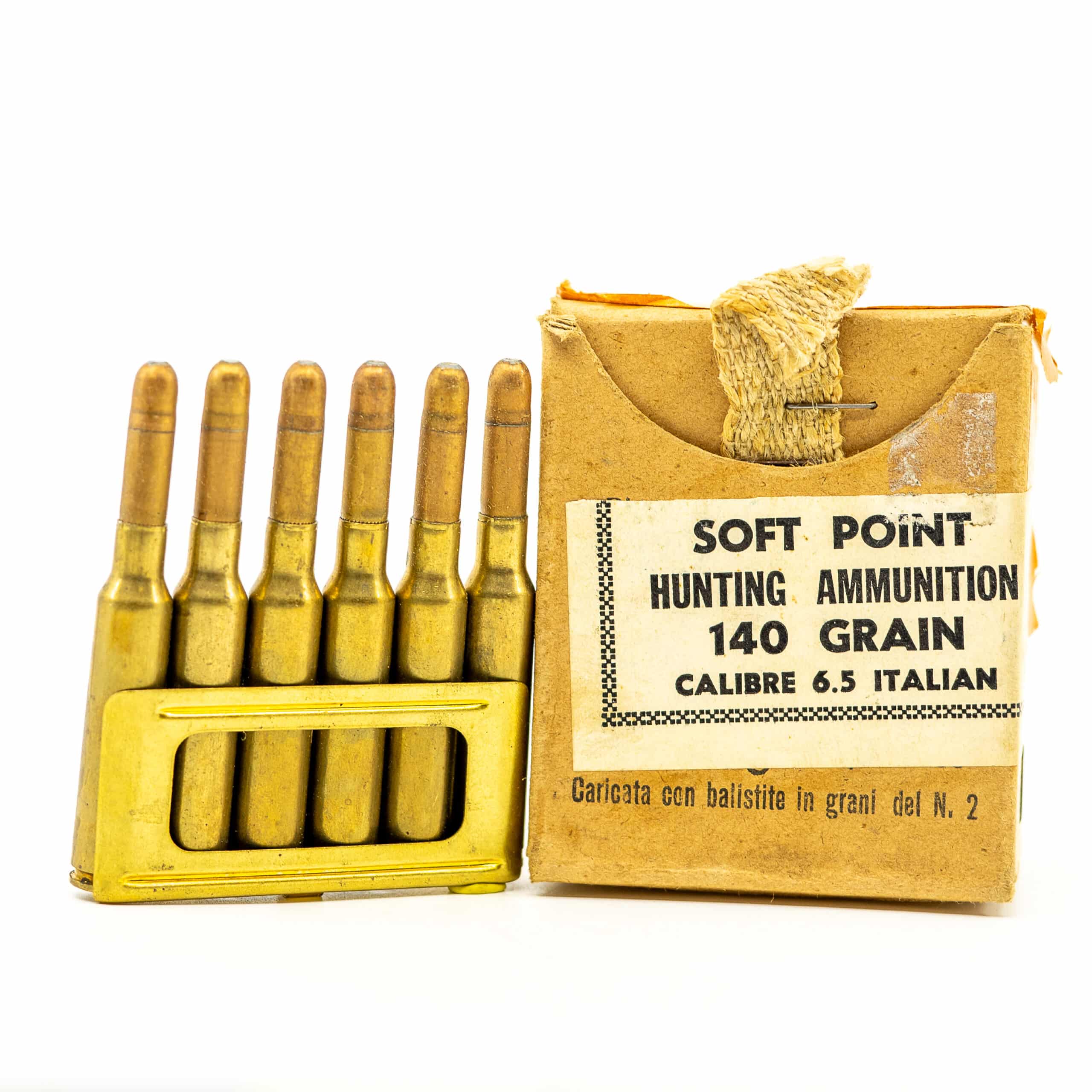 6.5 CARCANO “Hunting Ammunition” 10 rounds in stripper clips, each clip holds 5-rounds. Box has been opened, originally held 20 rounds. Caricata con balistite in granl del N. 2 (translated to: loaded with Ballistite (an early smokeless powder developed by Alfred Nobel). Ballistite-loaded ammunition is not equivalent to modern smokeless powders. Due to age, formulation differences, and degradation over time, it should not be fired without expert evaluation.