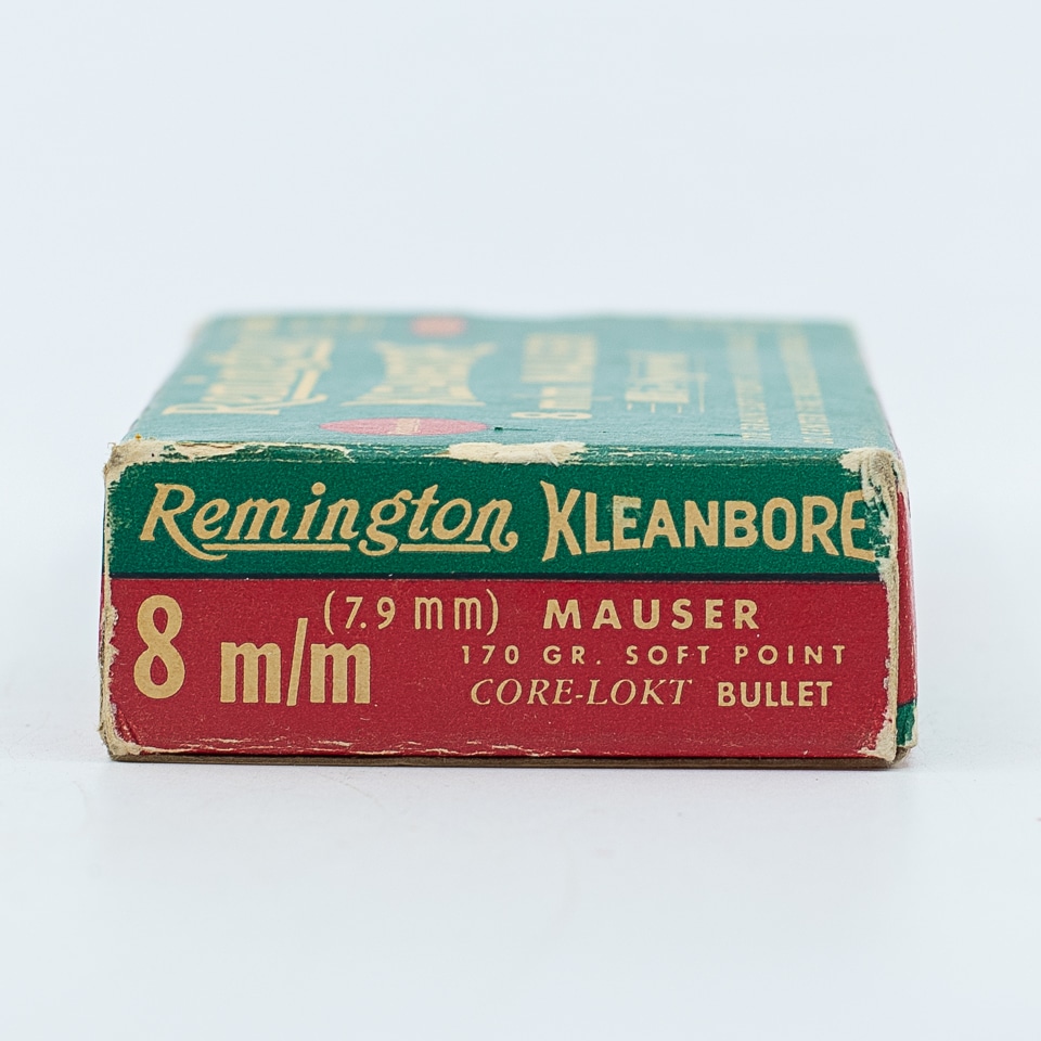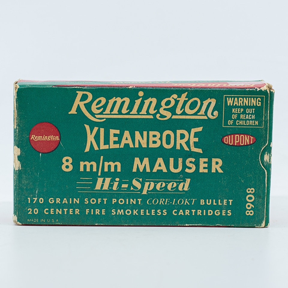 Remington “KLEANBORE” 8mm Mauser factory ammunition, 170-graon Core-Lokt bullets, 20 ROUNDS. Box is intact, shows shelf wear. Circa 1946-1960