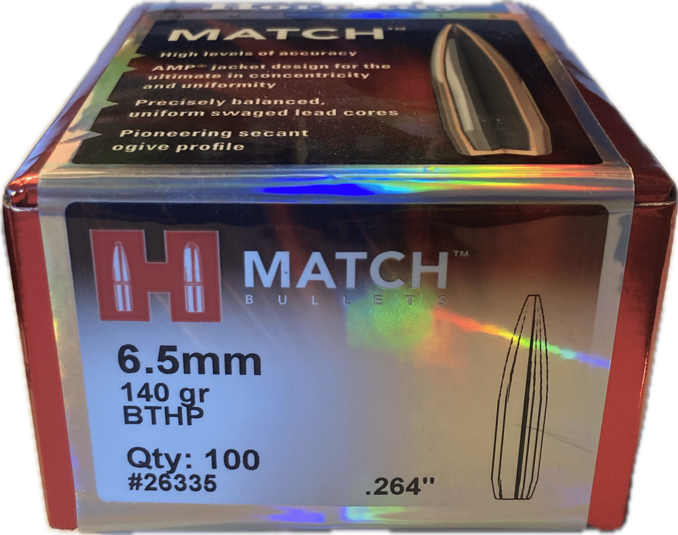Hornady “Match” #26335 .264 diameter 6.5 mm 140 grain Boat Tail Hollow Points bullets.